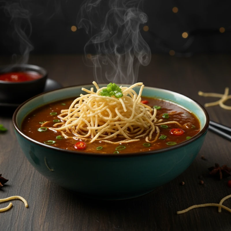 Manchow Soup is a bold and spicy Indo-Chinese soup packed with finely chopped vegetables, garlic, ginger, and soy sauce. Known for its fiery flavor and hearty feel, it’s topped with crispy fried noodles for the perfect crunch. The broth is dark, flavorful, and slightly thickened for a comforting mouthfeel. Popular as a starter, especially in winters, it’s ideal for those who enjoy punchy, garlicky, and warming soups. It can also be customized with chili vinegar or green chilies for extra heat.