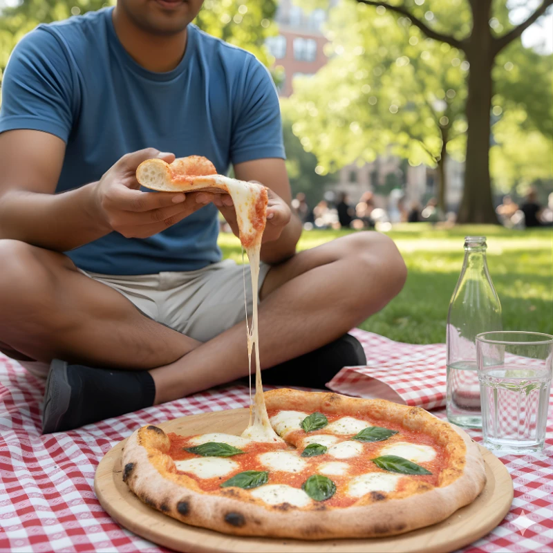 Classic Margherita Pizza made with fresh tomato sauce, mozzarella, and basil on a hand-rolled dough base. A timeless favorite with rich flavors and simple ingredients.
